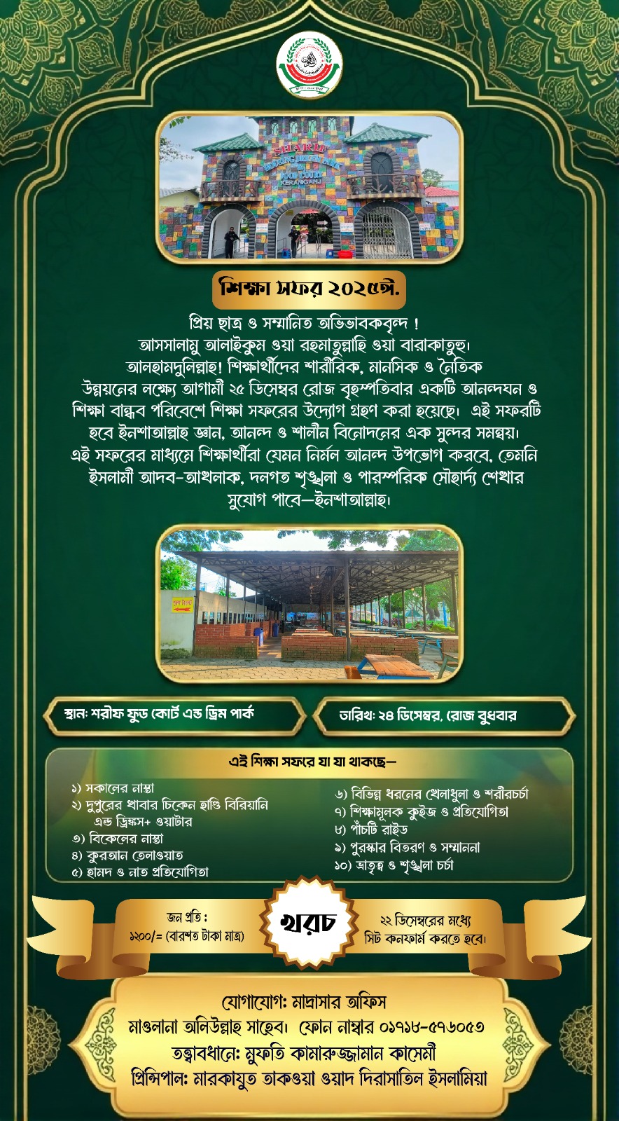আলহামদুলিল্লাহ! শিক্ষার্থীদের শারীরিক, মানসিক ও নৈতিক উন্নয়নের লক্ষ্যে আগামী ২৫ ডিসেম্বর রোজ বৃহস্পতিবার একটি আনন্দঘন ও শিক্ষা বান্ধব পরিবেশে শিক্ষা সফরের উদ্যোগ গ্রহণ করা হয়েছে। এই সফরটি হবে ইনশাআল্লাহ জ্ঞান, আনন্দ ও শালীন বিনোদনের এক সুন্দর সমন্বয়।